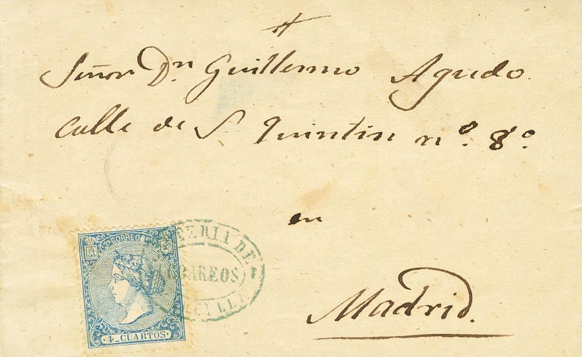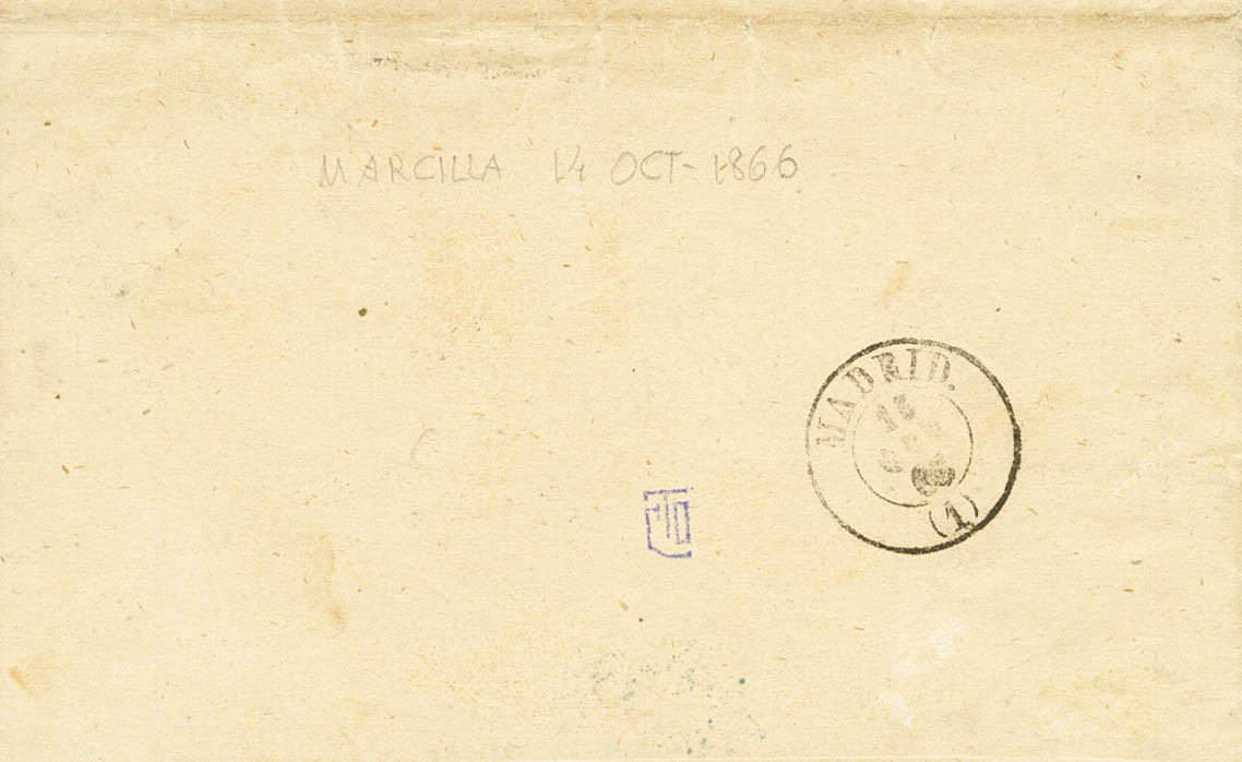 81. 1866. 4 cuartos azul. MARCILLA a MADRID. Matasello (oval) CARTERIA DE / CORREOS / MARCILLA, en azul. MAGNIFICA Y ESPECTACULAR ESTAMPACION Y MUY RARA.