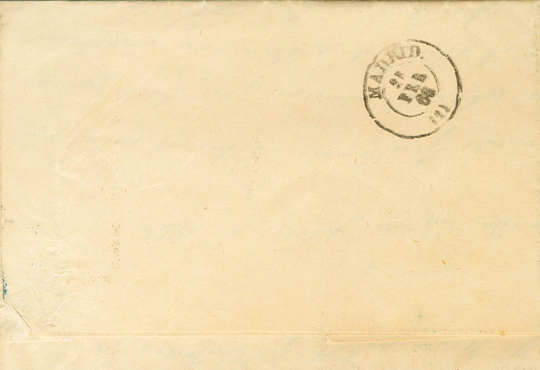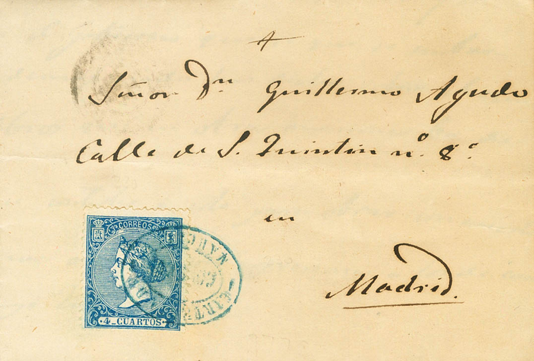 81. 1866. 4 cuartos azul. MARCILLA a MADRID. Matasello (oval) CARTERIA DE / CORREOS / MARCILLA, en azul. MAGNIFICA Y ESPECTACULAR ESTAMPACION Y MUY RARA.