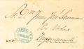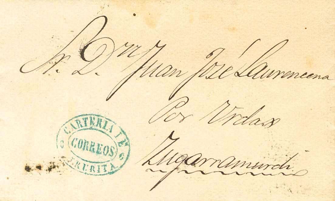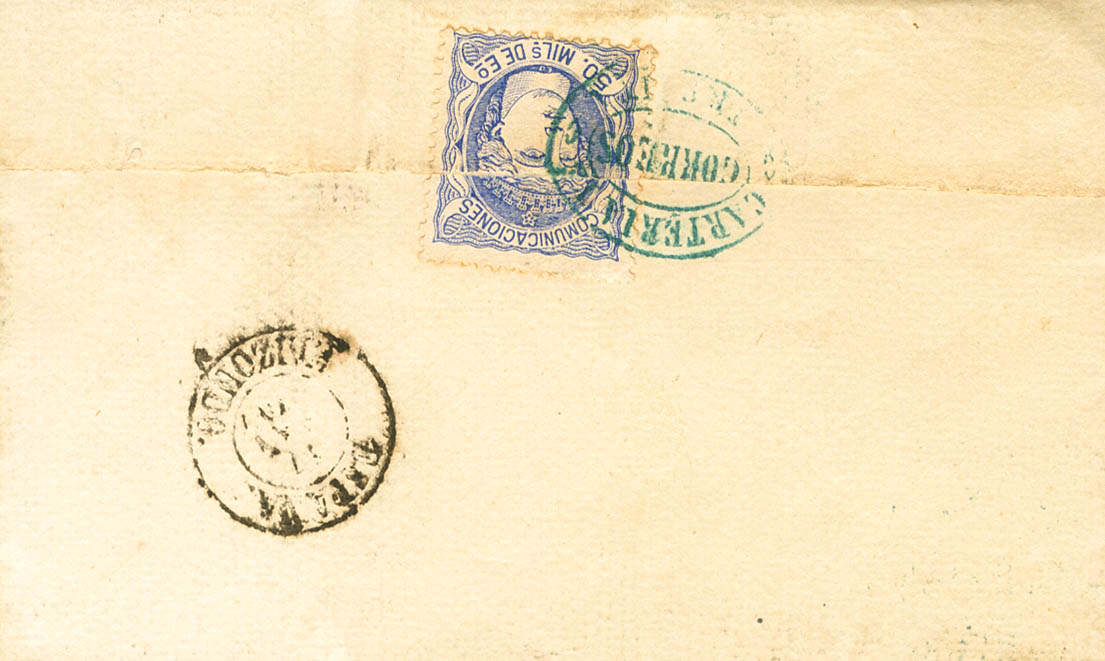 107. 1870. 50 mils ultramar, utilizado como cierre al dorso (partido en la parte central). GARZAIN (NAVARRA) a ZUGARRAMURDI (NAVARRA). En el frente marca (oval) CARTERIA DE / CORREOS / IRURITA, en azul, utilizada como matasellos al dorso. MAGNIFICA Y RARA.