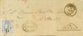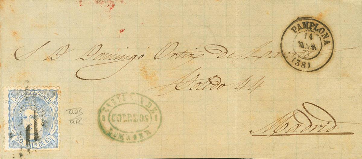 107. 1871. 50 mils ultramar. Frontal de LUMBIER (NAVARRA) a MADRID. En el frente marca (oval) CARTERIA DE / CORREOS / LUMBIER, en azul. MAGNIFICO.