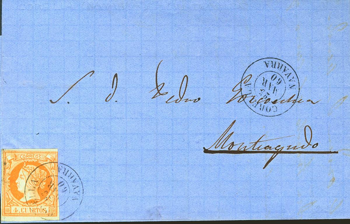 52. 1860. 4 cuartos naranja. FITERO (NAVARRA) a MONTEAGUDO. Matasello CORELLA / NAVARRA. MAGNIFICA ESTAMPACION.
