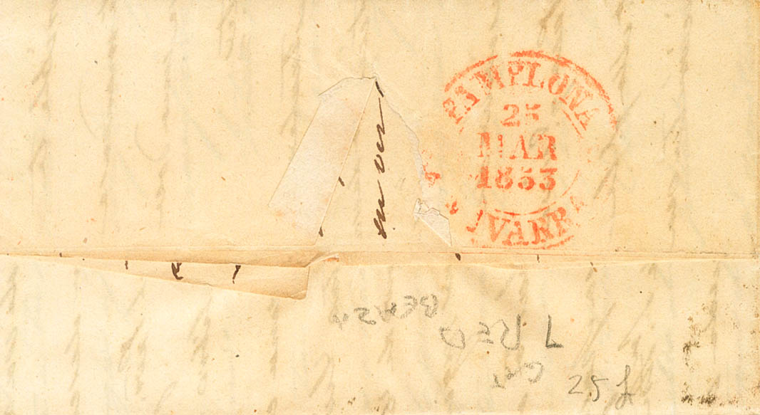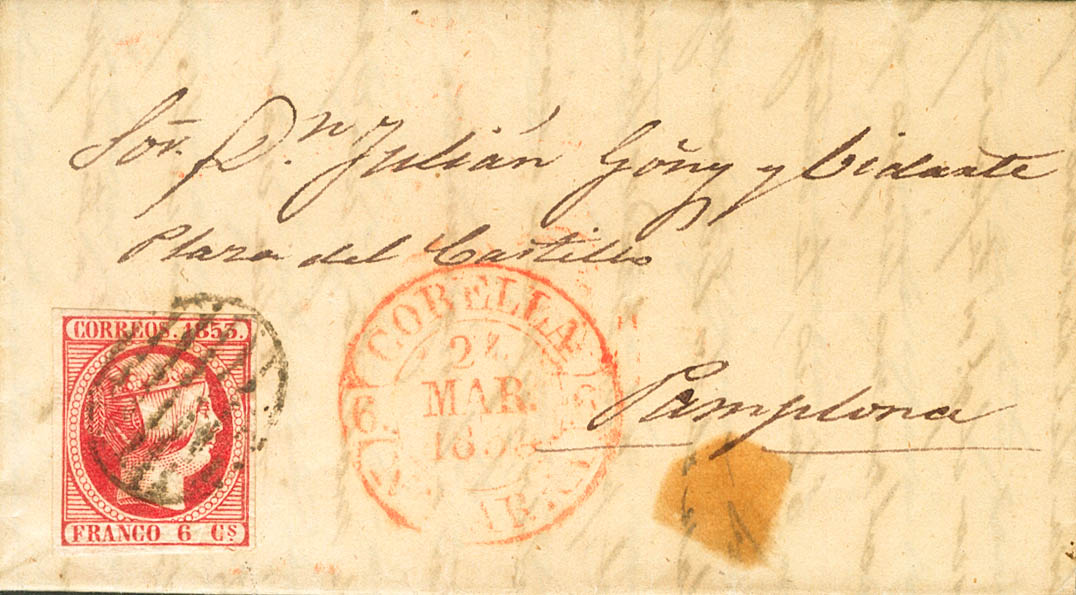 17. 1853. 6 cuartos carmÃn. CORELLA a PAMPLONA. En el frente baeza CORELLA / NAVARRA. MAGNIFICA.