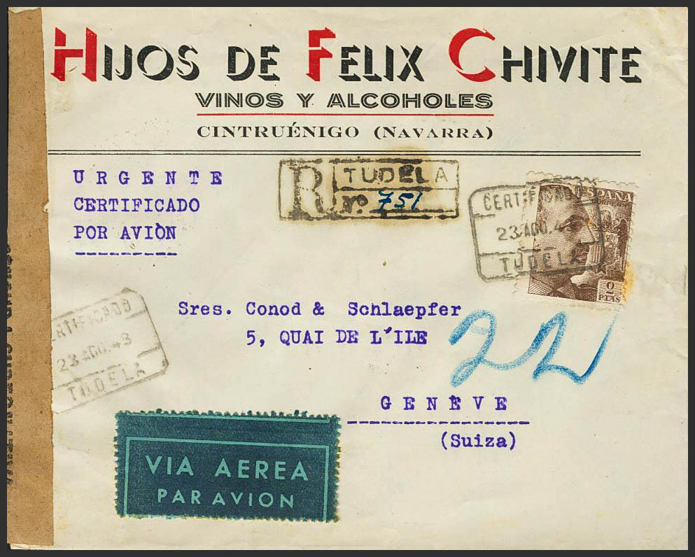 Navarra. Historia Postal. CERTIFICADO / TUDELA, al dorso tránsito. MAGNIFICA.