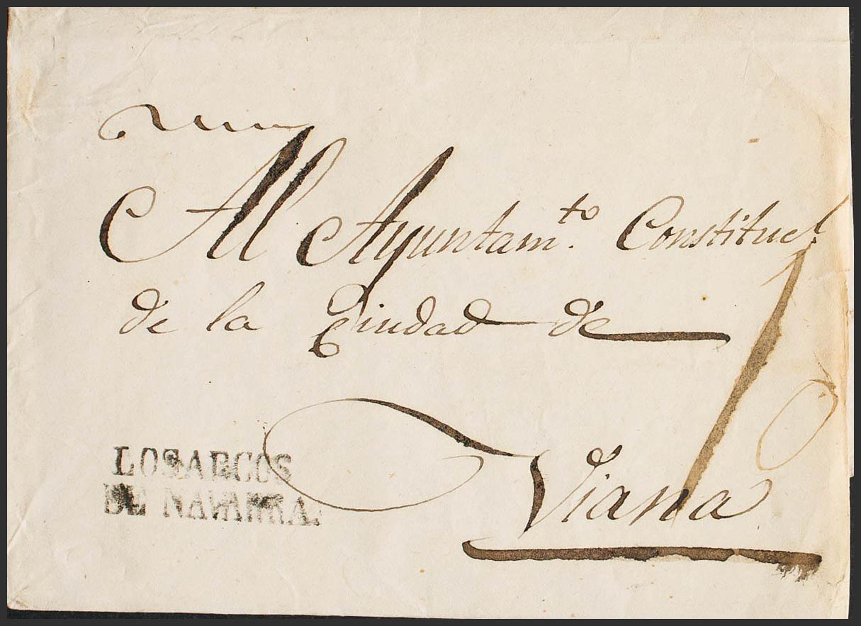 1843. LOS ARCOS a VIANA. Marca LOS ARCOS / DE NAVARRA, en negro (P.E.6) edición 2004. MAGNIFICA Y RARA.