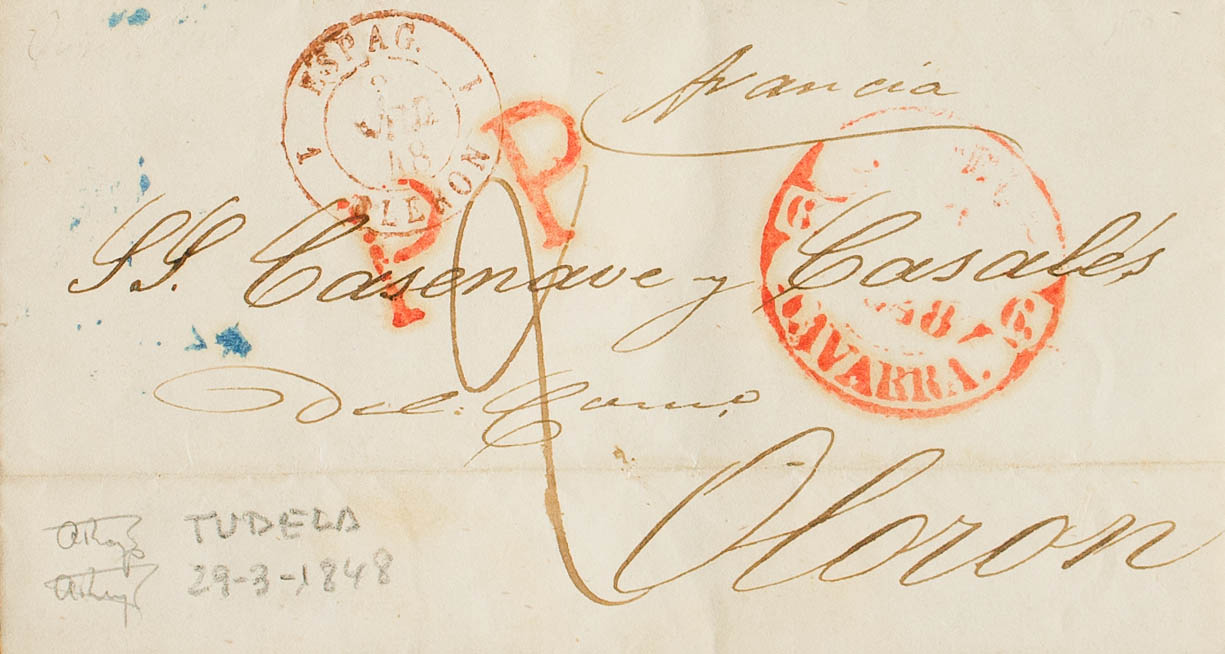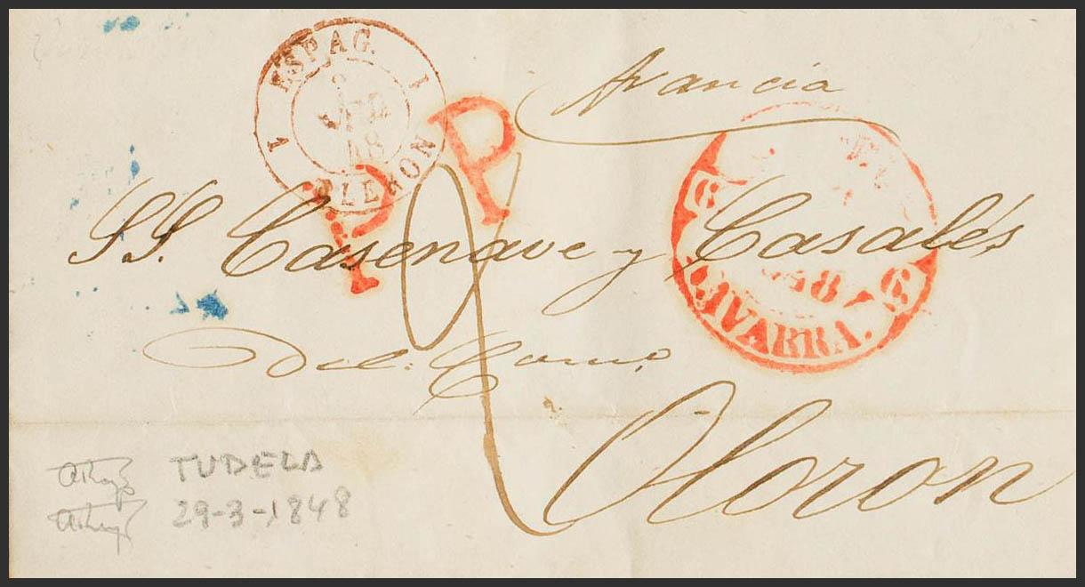 1848. TUDELA a OLORON (FRANCIA). Marca "P.P.", de Tudela (P.E.24) edición 2004. MAGNIFICA Y MUY RARA.