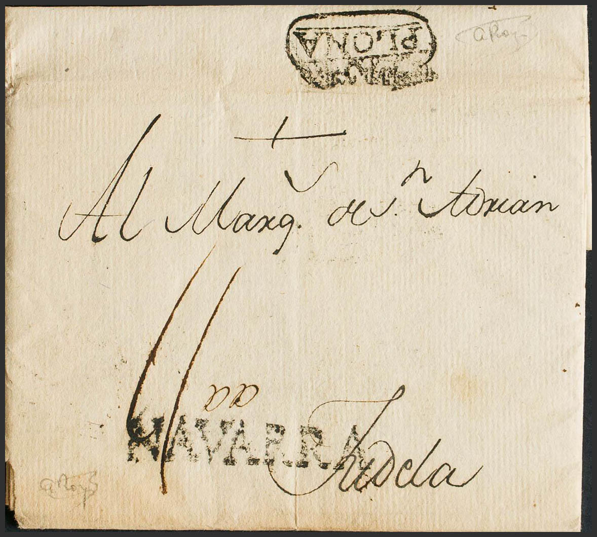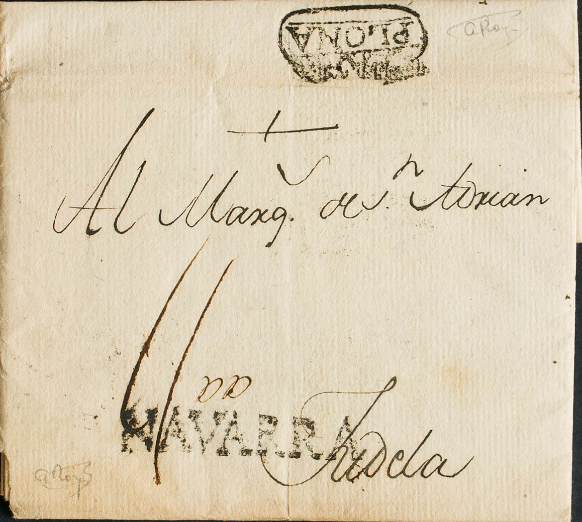 1779. PAMPLONA a TUDELA. Marcas NAVARRA, de Pamplona y al dorso PAM / PLONA (P.E.13 y P.E.14) edición 2004. MAGNIFICA Y MUY RARA.
