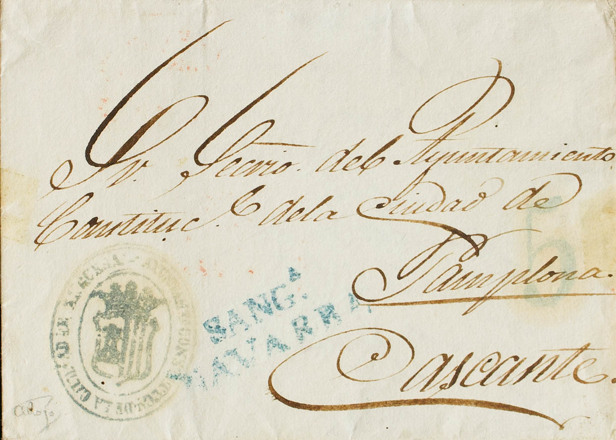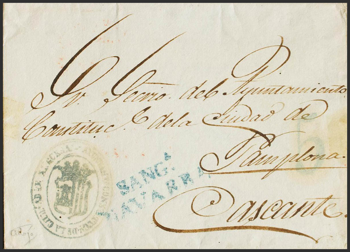 1843. SANGÜESA a CASCANTE. Marca SANGª / NAVARRA, en azul (P.E.4) edición 2004. MAGNIFICA Y RARA.