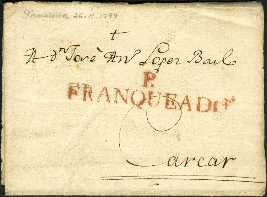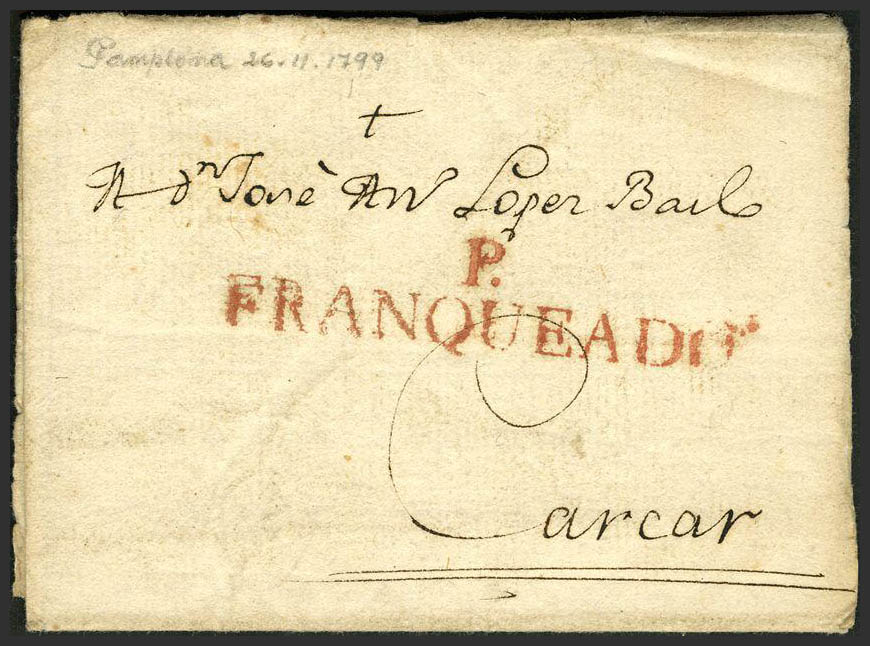 1799. PAMPLONA a CARCAR. Marca P. / FRANQUEADO, en rojo (P.E. 35) edición 2004. MAGNIFICA Y RARA.