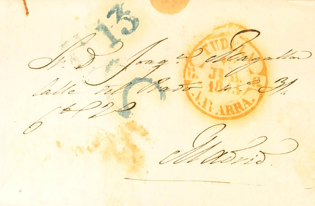 1845. TUDELA a MADRID. Baeza TUDELA / NAVARRA, en amarillo. MAGNIFICA.