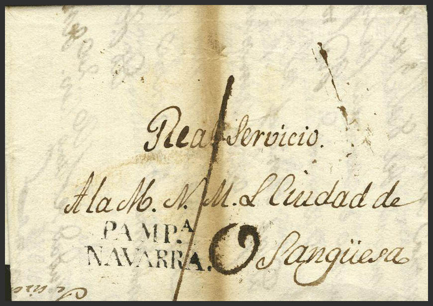 1825. PAMPLONA a SANGÜESA. Marca PAMPA. / NAVARRA, en negro (P.E.28) edición 2004, manuscrito "Servicio Oficial". MAGNIFICA.