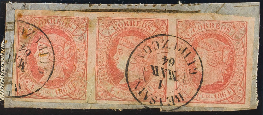 64(3). 1864. 4 cuartos rojo, tira de tres, sobre fragmento. Matasello BEASAIN / GUIPUZCOA. MAGNIFICA.