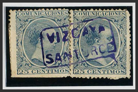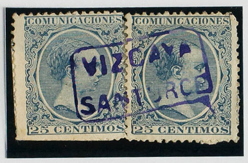 221(2). 1889. 25 cts azul, dos sellos (reforzados con fijasellos). Matasello carterÃa VIZCAYA / SANTURCE, en violeta. MAGNIFICA.