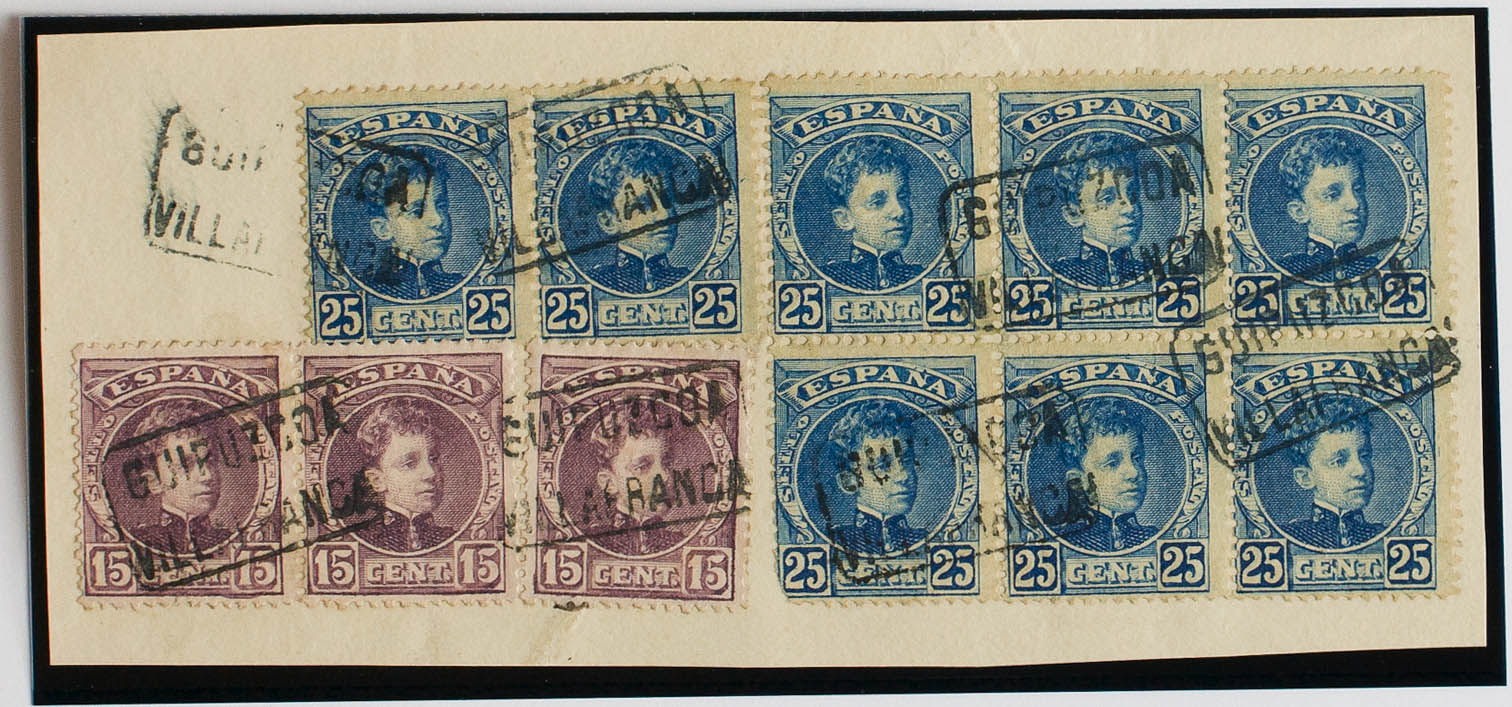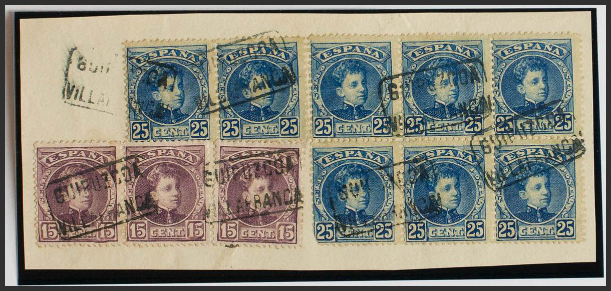 △ 245(3), 248(8). 1901. 15 cts castaño lila, tres sellos y 25 cts azul, ocho sellos, sobre fragmento. Matasello GUIPUZCOA / VILLAFRANCA. MAGNIFICA Y RARA, MUY ESPECTACULAR.