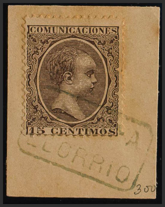 △ 219. 1889. 15 cts castaño, sobre fragmento. Matasello carterÃa VIZCAYA / ELORRIO. MAGNIFICO.