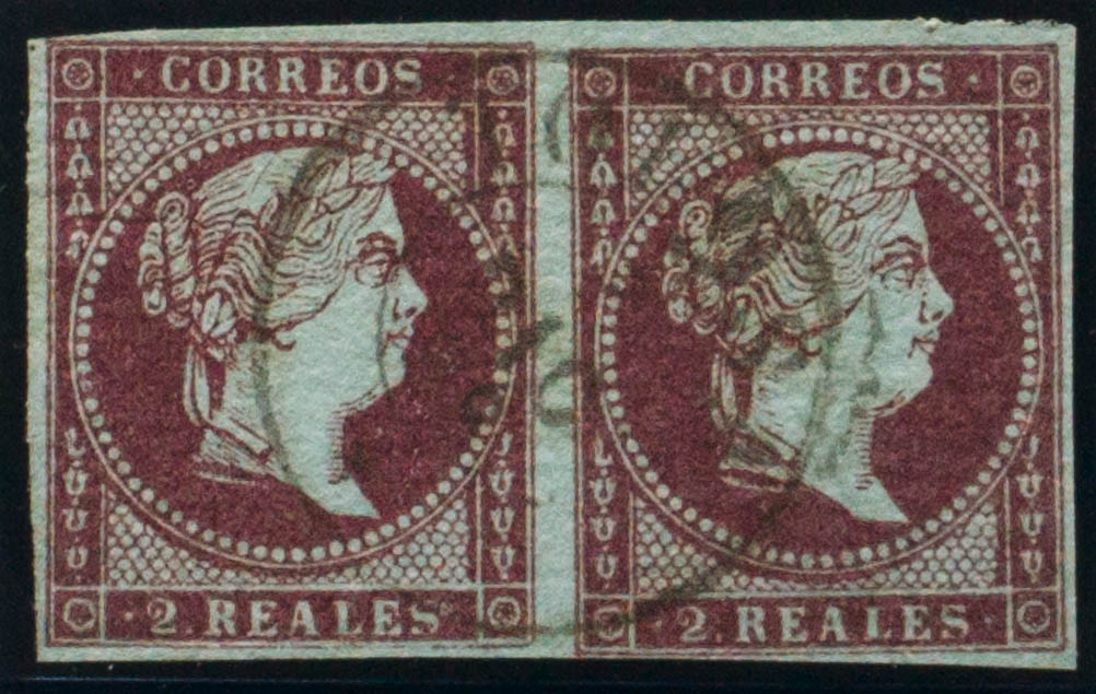 42(2). 1855. 2 reales violeta, pareja. Matasello TOLOSA / * (Tipo I). MAGNIFICA.