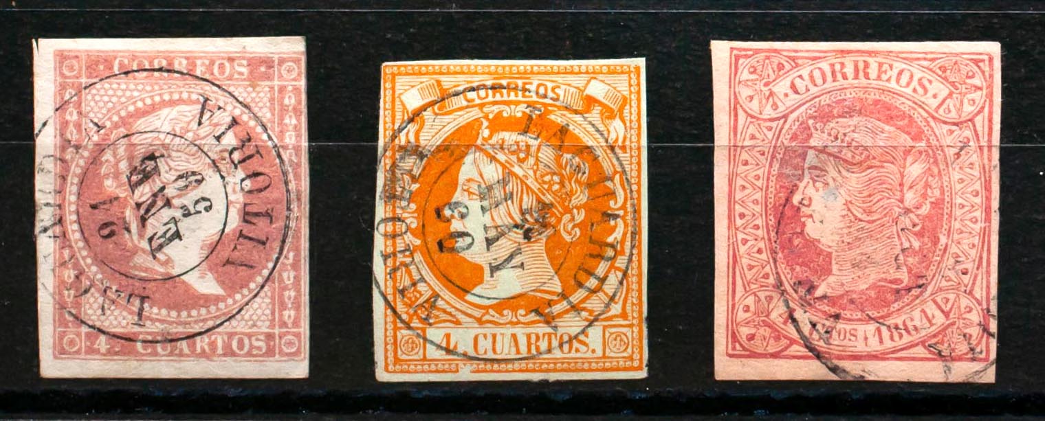 48, 52, 64. 1855. Conjunto de tres sellos del 4 cuartos rojo, amarillo y rosa, inutilizados con el matasello LA GUARDIA / VITORIA. MAGNIFICO.