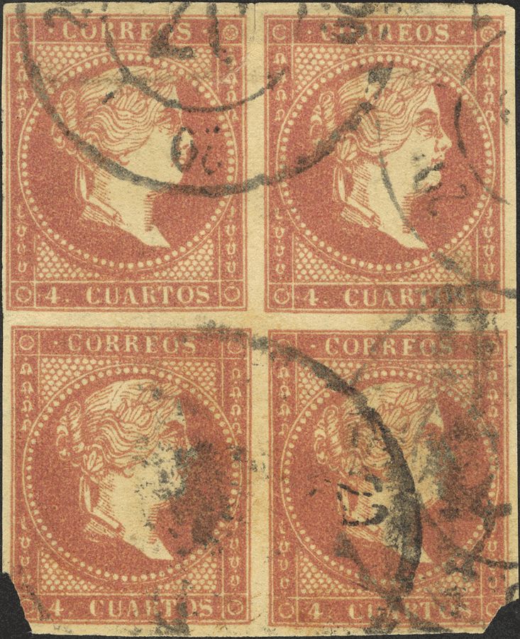 48(4). 1856. 4 cuartos rojo, bloque de cuatro. Matasello R. CARRETA Nº 20, ligero defecto.