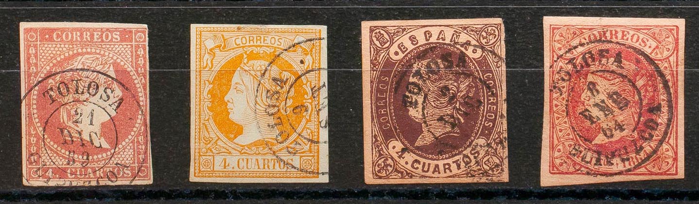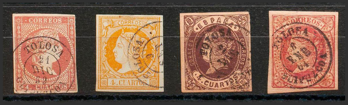 48, 52, 58, 64. (1855ca). Conjunto de cuatro sellos del 4 cuartos rojo, amarillo, castaño y rosa, inutilizados con matasello TOLOSA / GUIPUZCOA. MAGNIFICO.