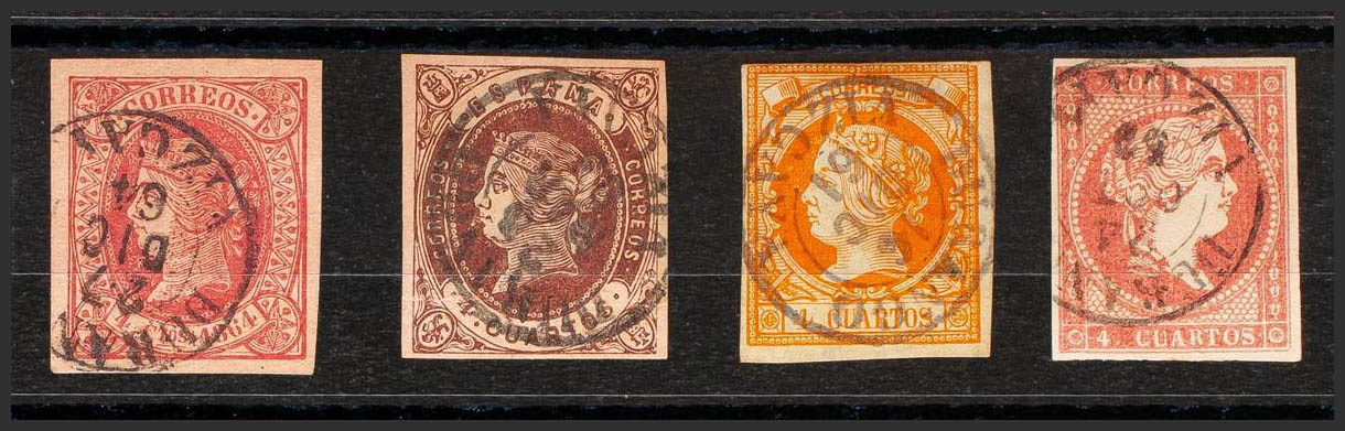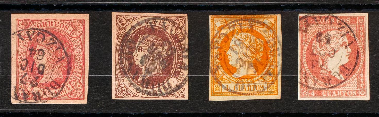 48, 52, 58, 64. (1855ca). Conjunto de cuatro sellos del 4 cuartos rojo, amarillo, castaño y rosa, inutilizados con matasello DURANGO / VIZCAYA (Tipo I). MAGNIFICO.