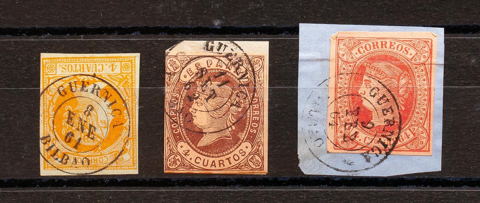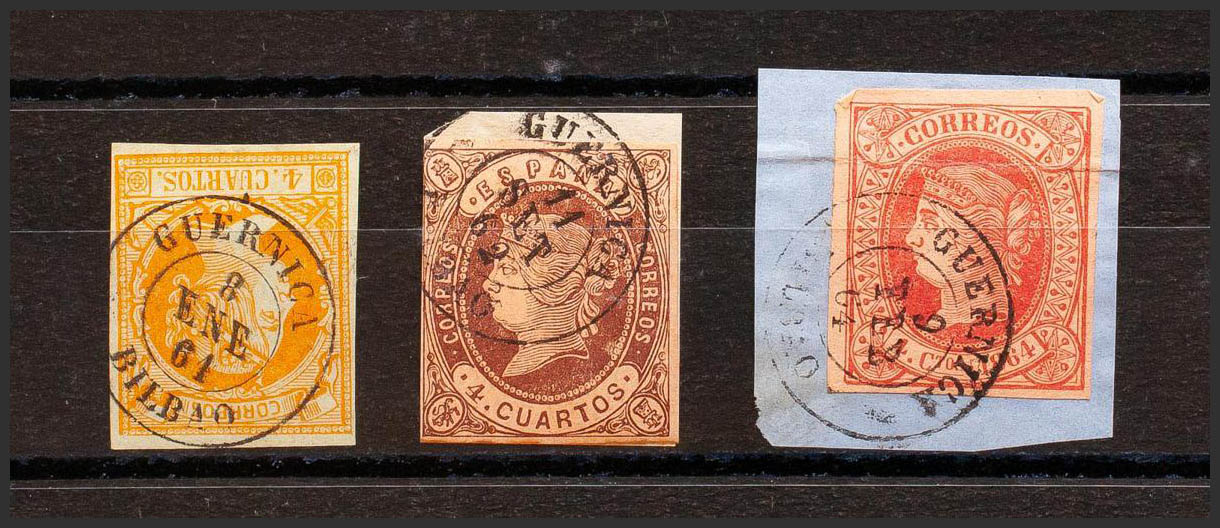 52, 58, 64. (1860ca). Conjunto de tres sellos del 4 cuartos amarillo, castaño y rosa, inutilizados con el matasello GUERNICA / BILBAO. MAGNIFICO.