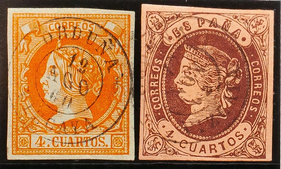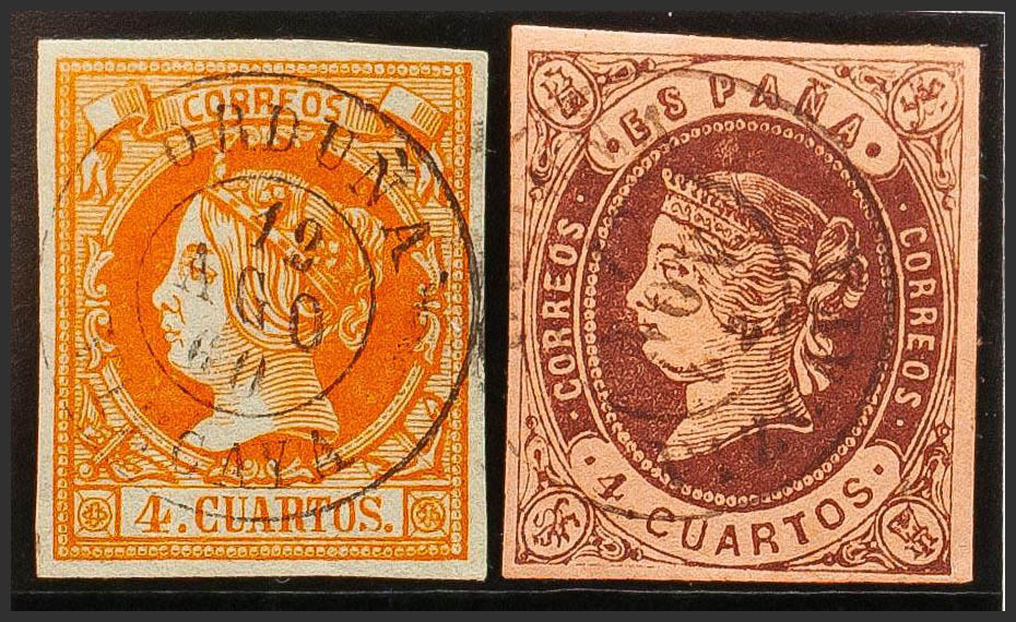 52, 58. (1860ca). Conjunto de dos sellos del 4 cuartos amarillo y 4 cuartos castaño, inutilizados con matasello ORDUÑA / VIZCAYA. MAGNIFICO.