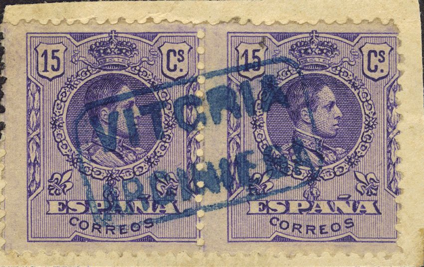 △ 270(2). 1909. 15 cts violeta, pareja sobre fragmento. Matasello VITORIA / ARCINIEGA. MAGNIFICO.