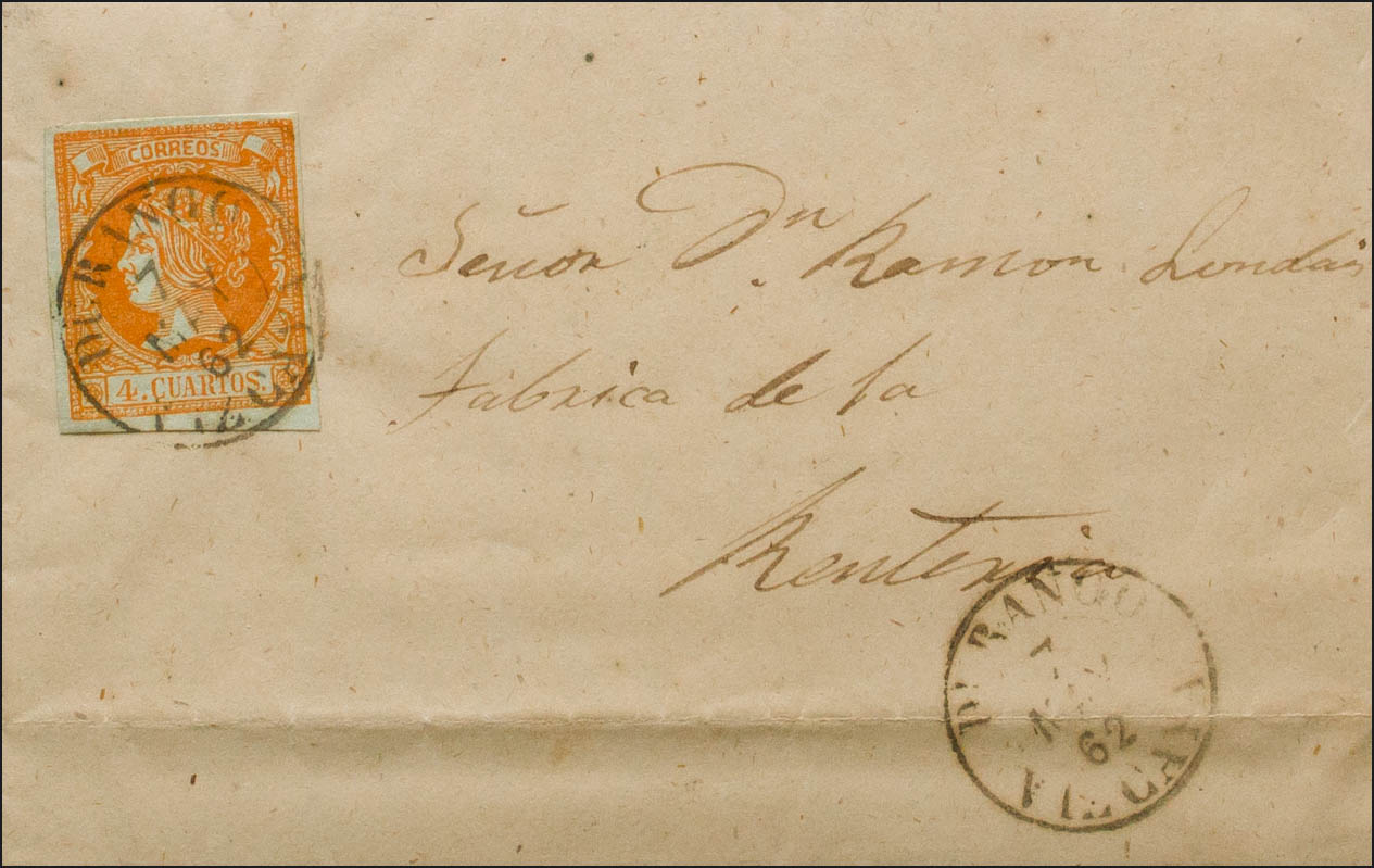 52. 1862. 4 cuartos naranja. DURANGO a RENTERIA. Matasello DURANGO / VIZCAYA (Tipo I). MAGNIFICA.