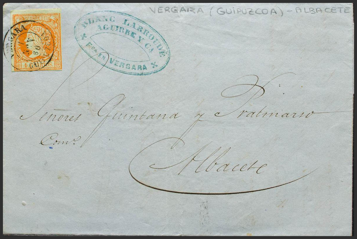 52. 1860. 4 cuartos naranja. VERGARA a ALBACETE. Matasello VERGARA / GUIPUZCOA. MAGNIFICA.