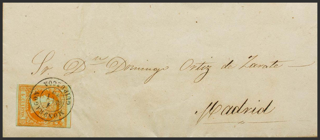52. 1860. 4 cuartos naranja. MONDRAGON a MADRID. Matasello MONDRAGON / GUIPUZCOA. MAGNIFICA.
