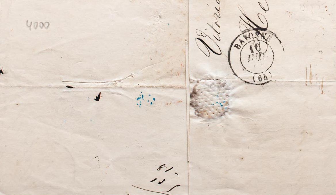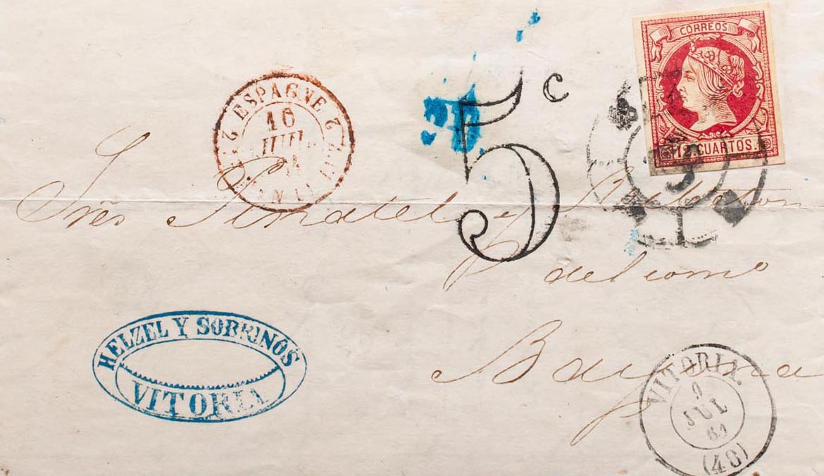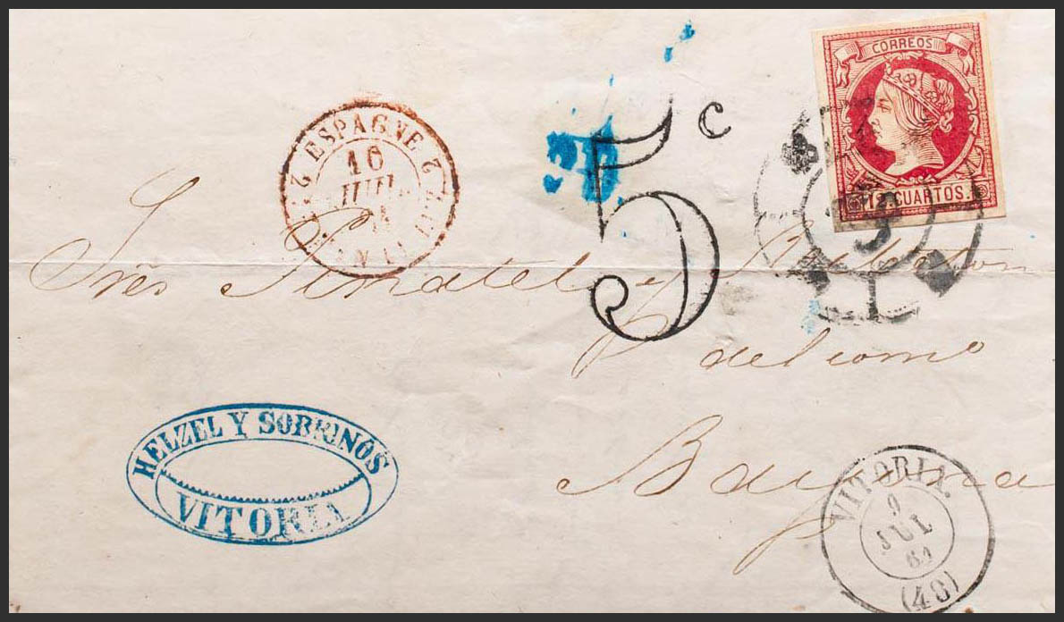 53. 1861. 12 cuartos carmÃn. VITORIA a BAYONA (FRANCIA). Matasello R.CARRETA Nº48. MAGNIFICA.