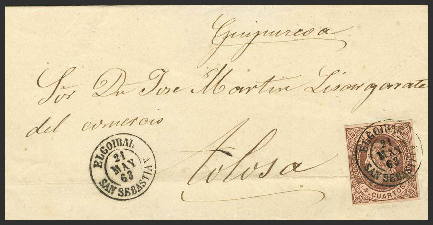 58. 1863. 4 cuartos castaño. ELGOIBAR a TOLOSA. Matasello ELGOIBAR / SAN SEBASTIAN. MAGNIFICA.