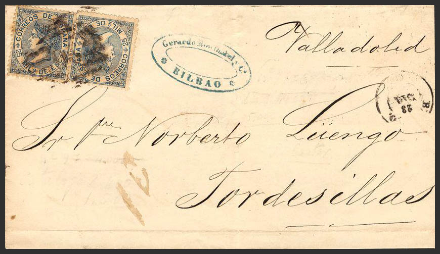 97(2). 1868. 25 mils azul, dos sellos. BILBAO a TORDESILLAS. MAGNIFICA Y RARA COMBINACION PARA COMPONER LA TARIFA DE 50 MILS.