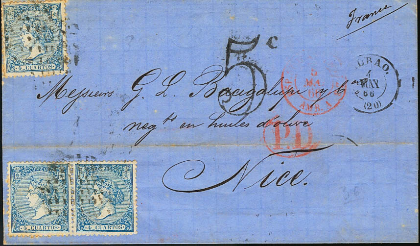 81(3). 1866. 4 cuartos azul, tres sellos. BILBAO a NIZA (FRANCIA). Matasello CIRCULO DE BILBAO. MAGNIFICA Y RARA.