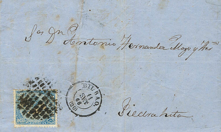 81. 1866. 4 cuartos azul. BILBAO a PIEDRAHITA. Matasello CIRCULO DE PUNTOS. MAGNIFICA.