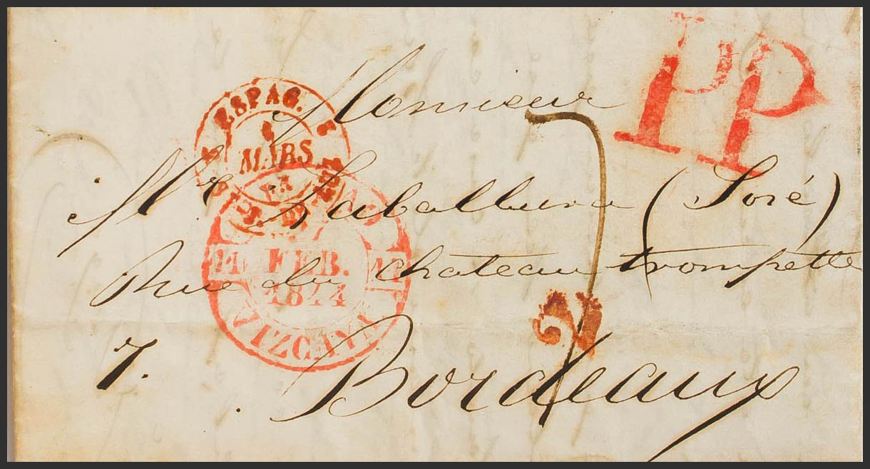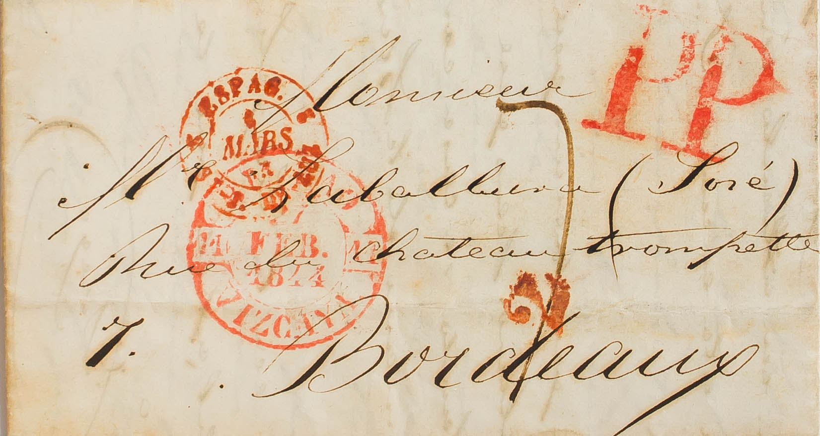 1844. BILBAO a BURDEOS (FRANCIA). Marca "P.P.", de Portes Pagados (P.E.31) edición 2004. MAGNIFICA Y RARA.