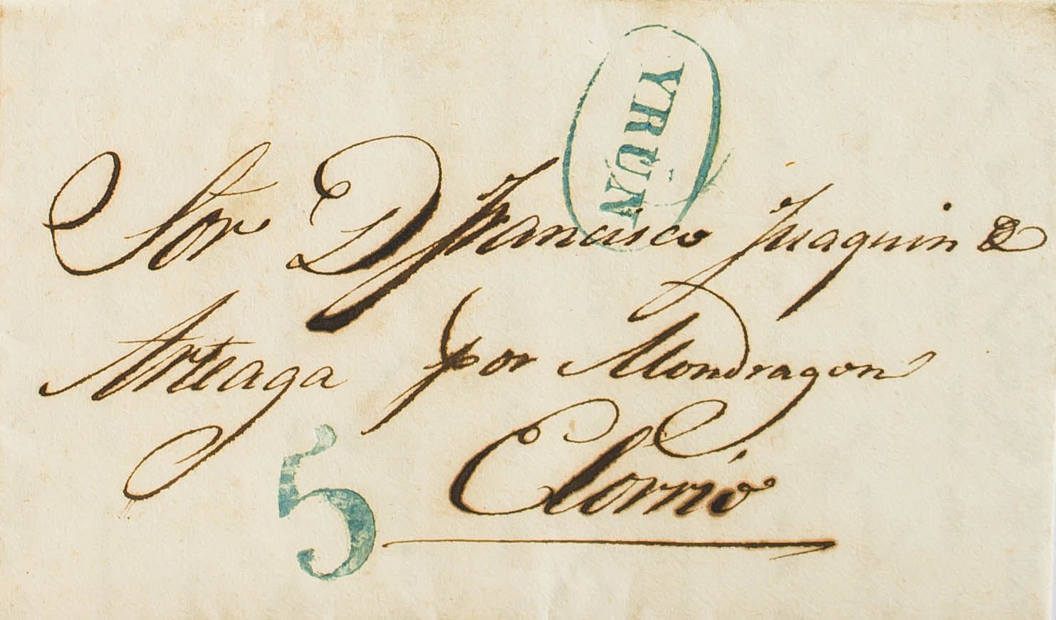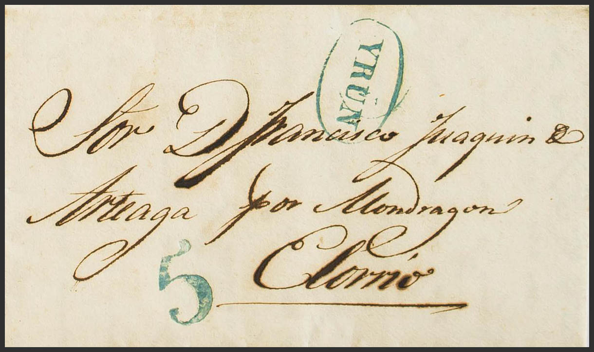 1840. HENDAYA (FRANCIA) a ELORRIO. Marca YRUN, en azul (P.E.9) edición 2004. MAGNIFICA Y RARA.