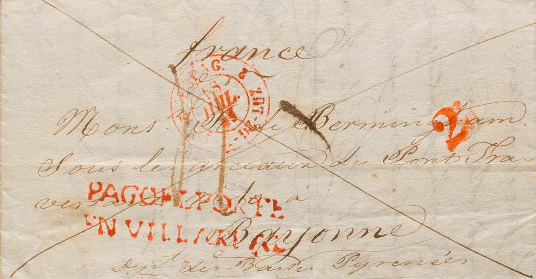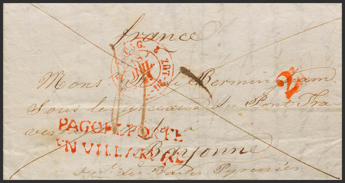 1841. AZCOITIA a BAYONA (FRANCIA). Marca PAGO EL PORTE / EN VILLAREAL, en rojo (P.E.12) edición 2004. MAGNIFICA Y MUY RARA Y ESPECTACULAR ESTAMPACION DE LA MARCA.