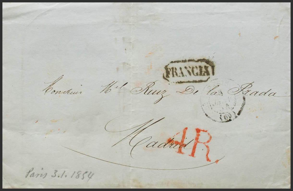 1854. PARIS a MADRID. Marca FRANCIA, en negro aplicada en Irún para indicar el origen (P.E.26) edición 2004. MAGNIFICA Y RARA.