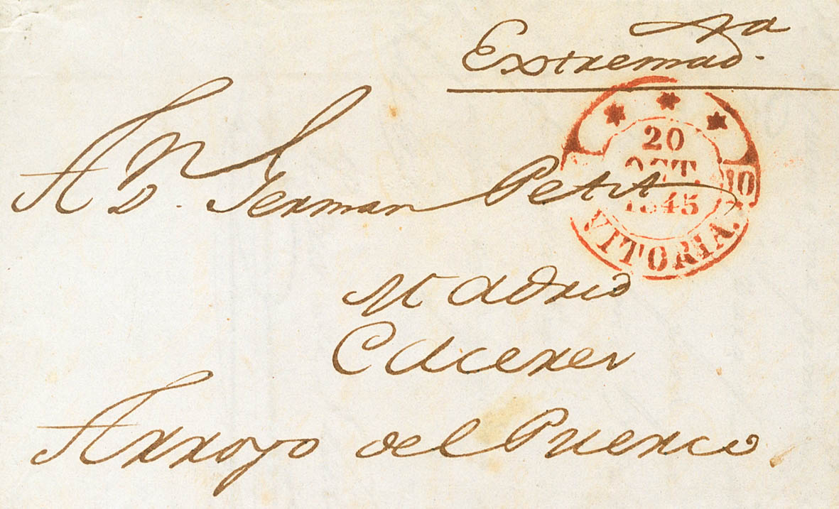 1845. VITORIA a ARROYO DEL PUERCO (CACERES). Baeza *** / VITORIA, en rojo. MAGNIFICA Y ESPECTACULAR ESTAMPACION.