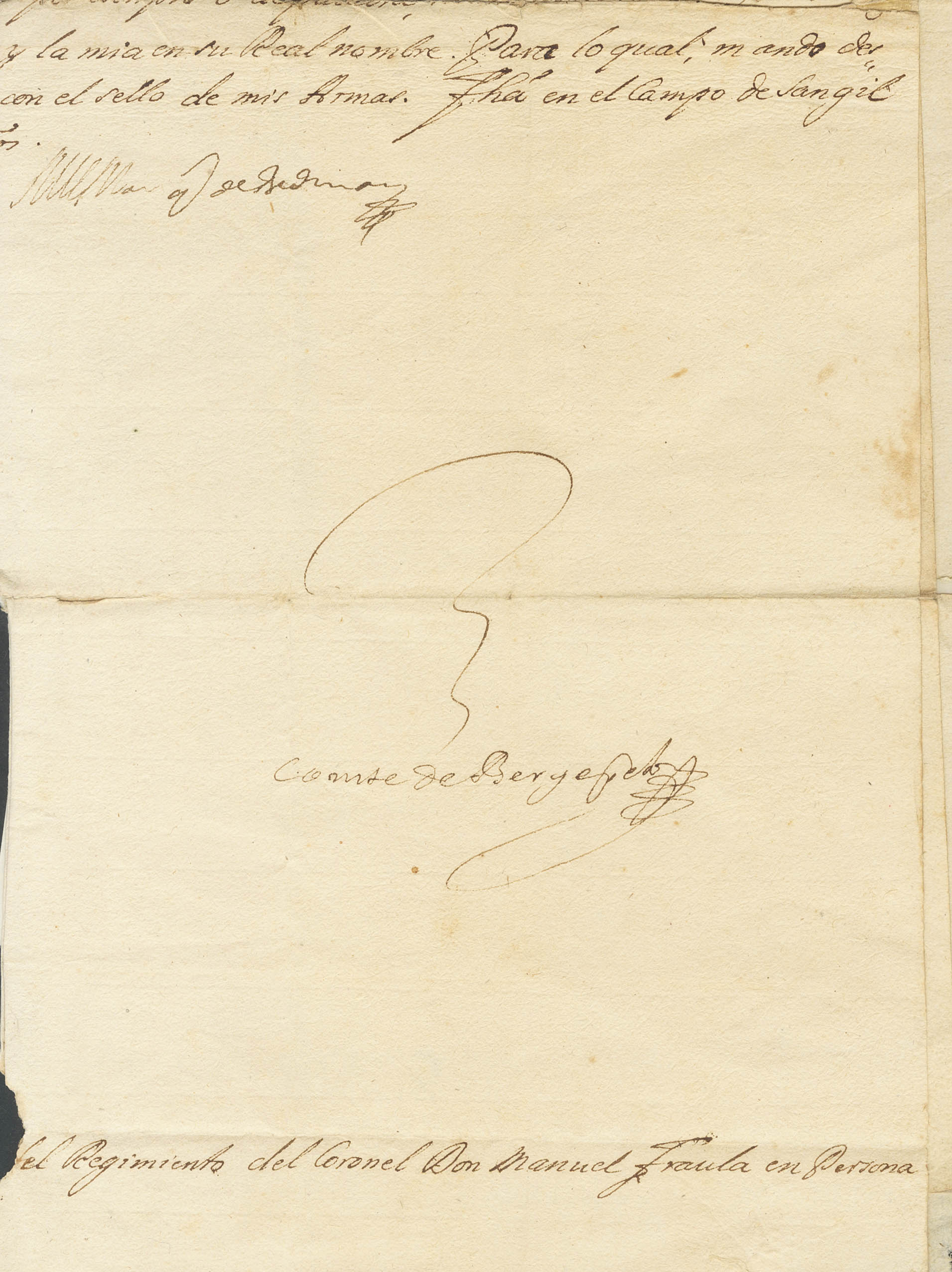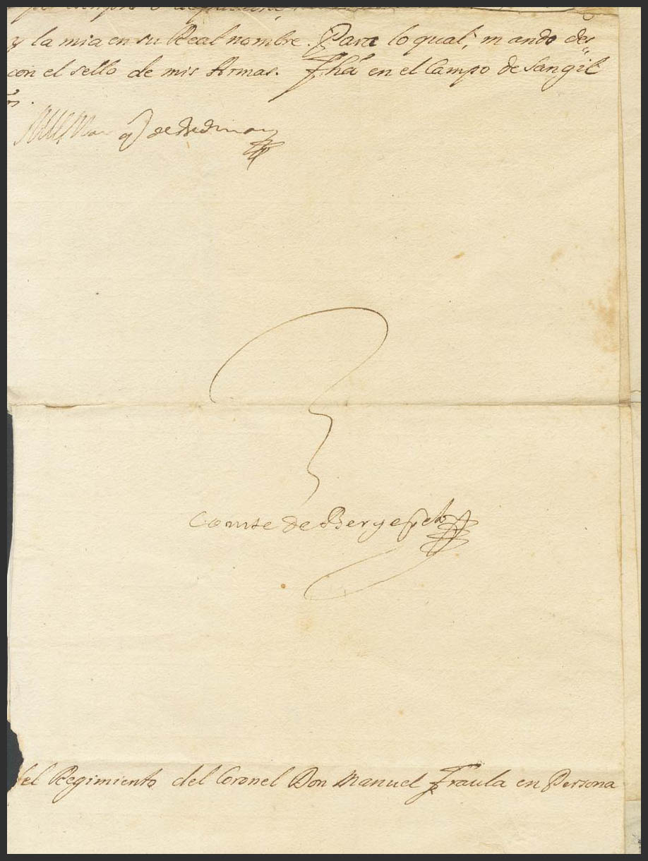 1703. Interesante documento de nombramiento de un Capitán de la CompañÃa de Caballos Corazas Españoles, fechado en el campo de San Gil el 28 de Agosto de 1703 y firmado por Don Isidro de la Cueva y Benavides, Marqués de Bedmar y Comandante General de los PaÃses Bajos y Gentilhombre de Cámara de Felipe V (conserva la oblea completa). MAGNIFICO Y RARO DOCUMENTO FECHADO DURANTE EL CONFLICTO DE LA GUERRA DE SUCESION ESPAÑOLA.