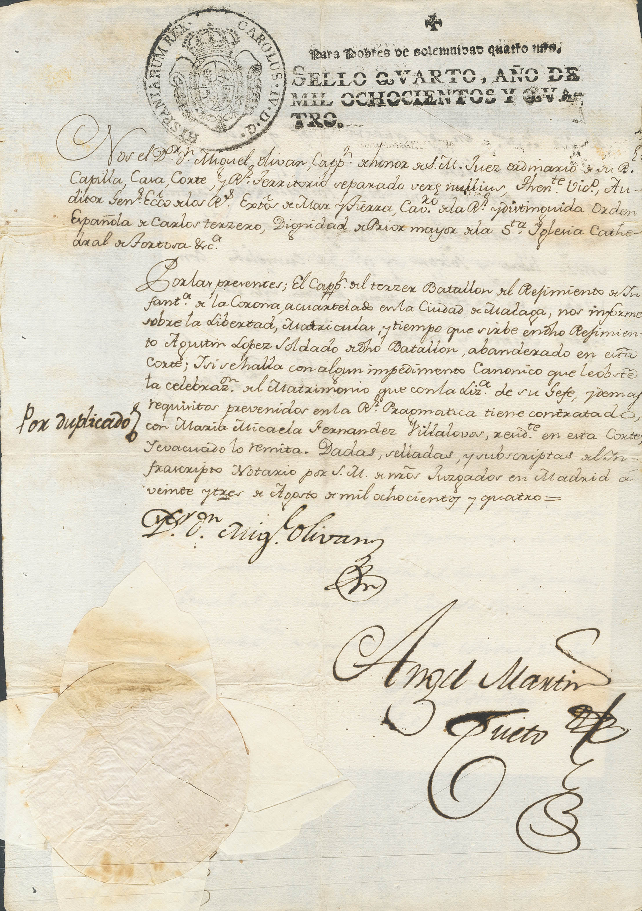 1804. Documento notarial sobre papel sellado PARA POBRES DE SOLEMNIDAD QUATRO MRS / SELLO QUARTO, AÑO DE MIL OCHOCIENTOS Y QUATRO, solicitando a un oficial de un Regimiento de InfanterÃa acuartelado en Málaga, el permiso para la celebración de la boda de un soldado de su acuartelamiento, fechado en Madrid el 23 de Agosto de 1804 y firmado por el Notario Angel MartÃn Cueto (conserva la oblea completa). MAGNIFICO Y RARO.