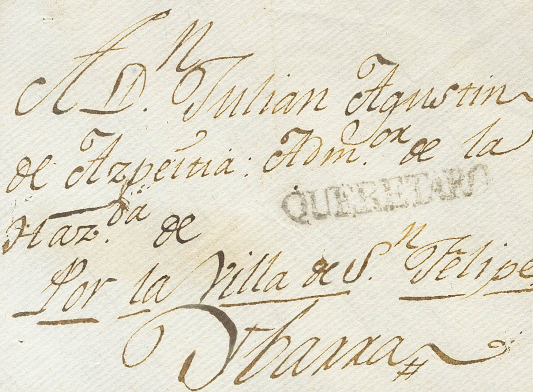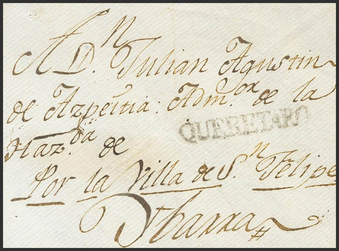 (1808ca). Frontal de QUERETARO a YBARRA (GUANAJUATO). Marca QUERETARO (P.E.2) edición 2004. MAGNIFICA Y RARISIMA CIRCULADO DURANTE EL PERIODO COLONIAL ESPAÑOL, ESTA MARCA SOLO SE UTILIZO EN 1808.