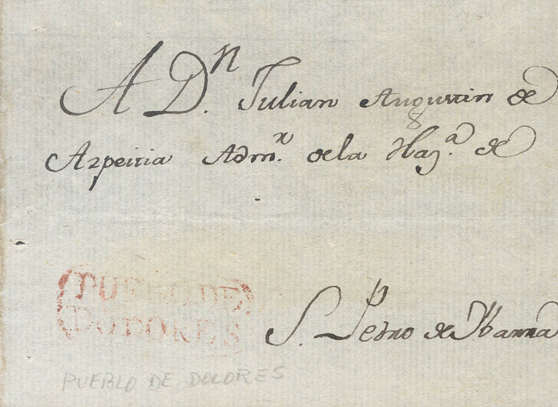 (1809ca). Frontal de PUEBLO DE DOLORES (GUANAJUATO) a SAN PEDRO DE IBARRA. Marca PUEBLO DE / DOLORES, en rojo (P.E.1) edición 2004. MAGNIFICA Y EXTRAORDINARIAMENTE RARA, ESTA MARCA SOLO SE UTILIZO DURANTE EL PERIODO COLONIAL ESPAÑOL.