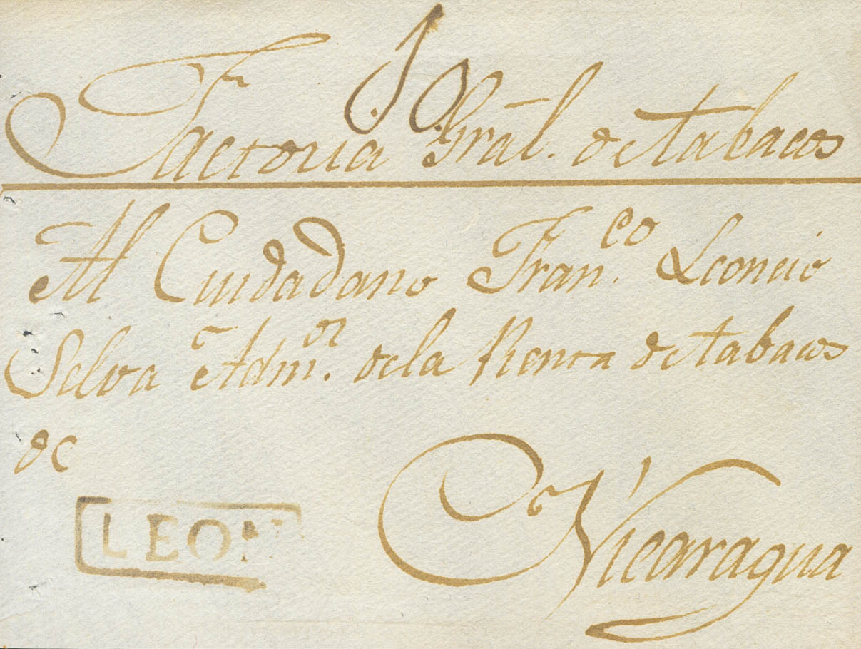 (1798ca). Frontal de LEON a NICARAGUA. Marca LEON, en tinta de escribir, en nuestra opinión su estampación se produce durante el periodo colonial español en América (P.E.2) edición 2004. MAGNIFICO Y MUY RARO, NO CATALOGADO EN ESTE COLOR.