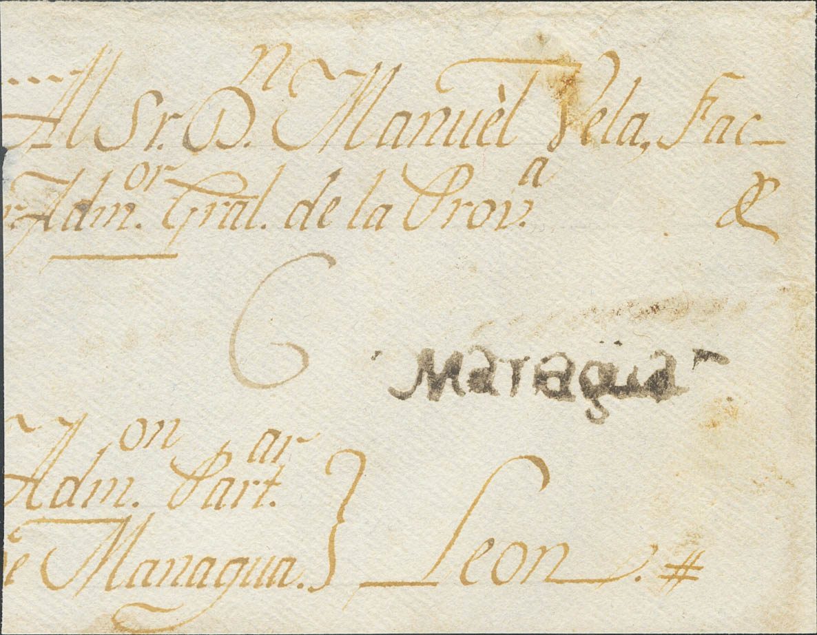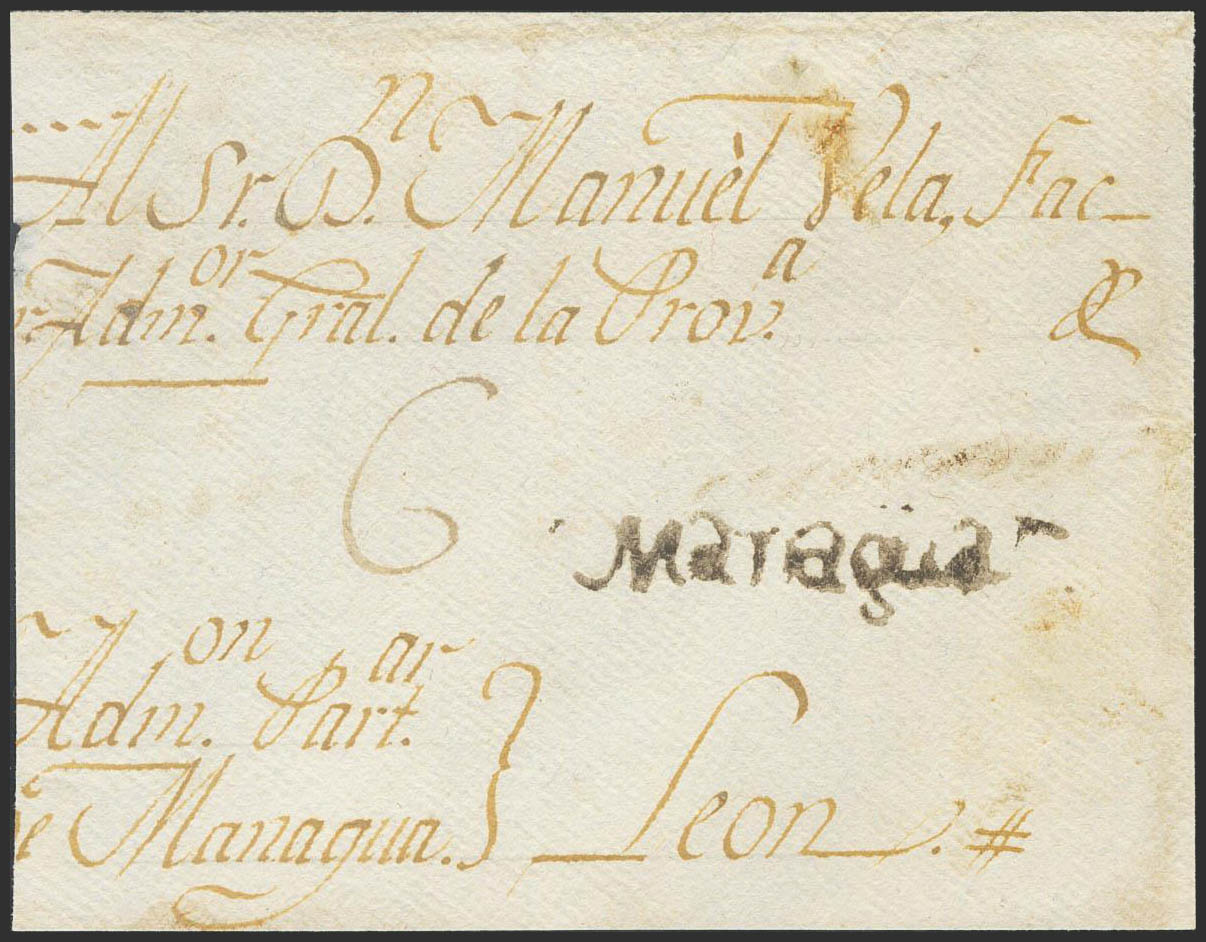 (1812ca). Frontal de MANAGUA a LEON. Marca MANAGUA, en tinta de escribir, en nuestra opinión su estampación se produce durante el periodo colonial español en América (P.E.2) edición 2004. MAGNIFICO Y MUY RARO.