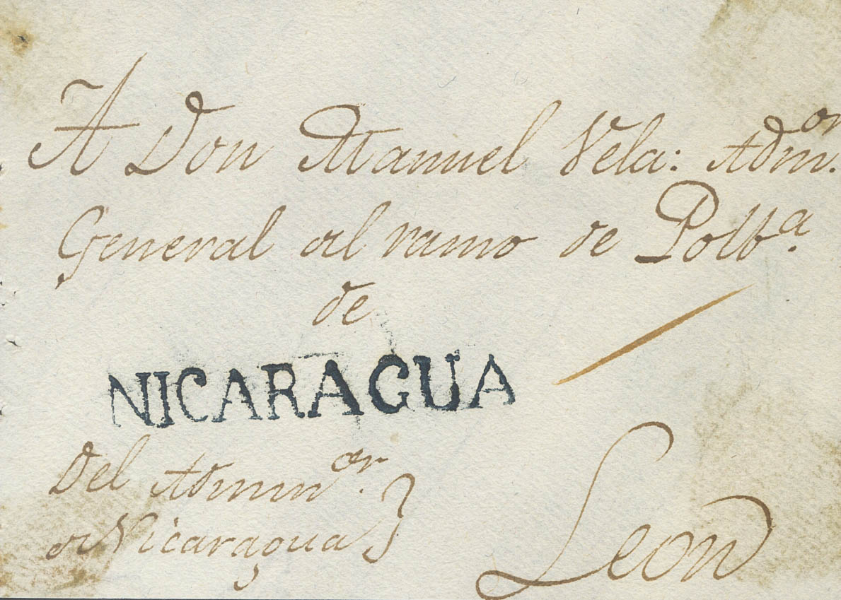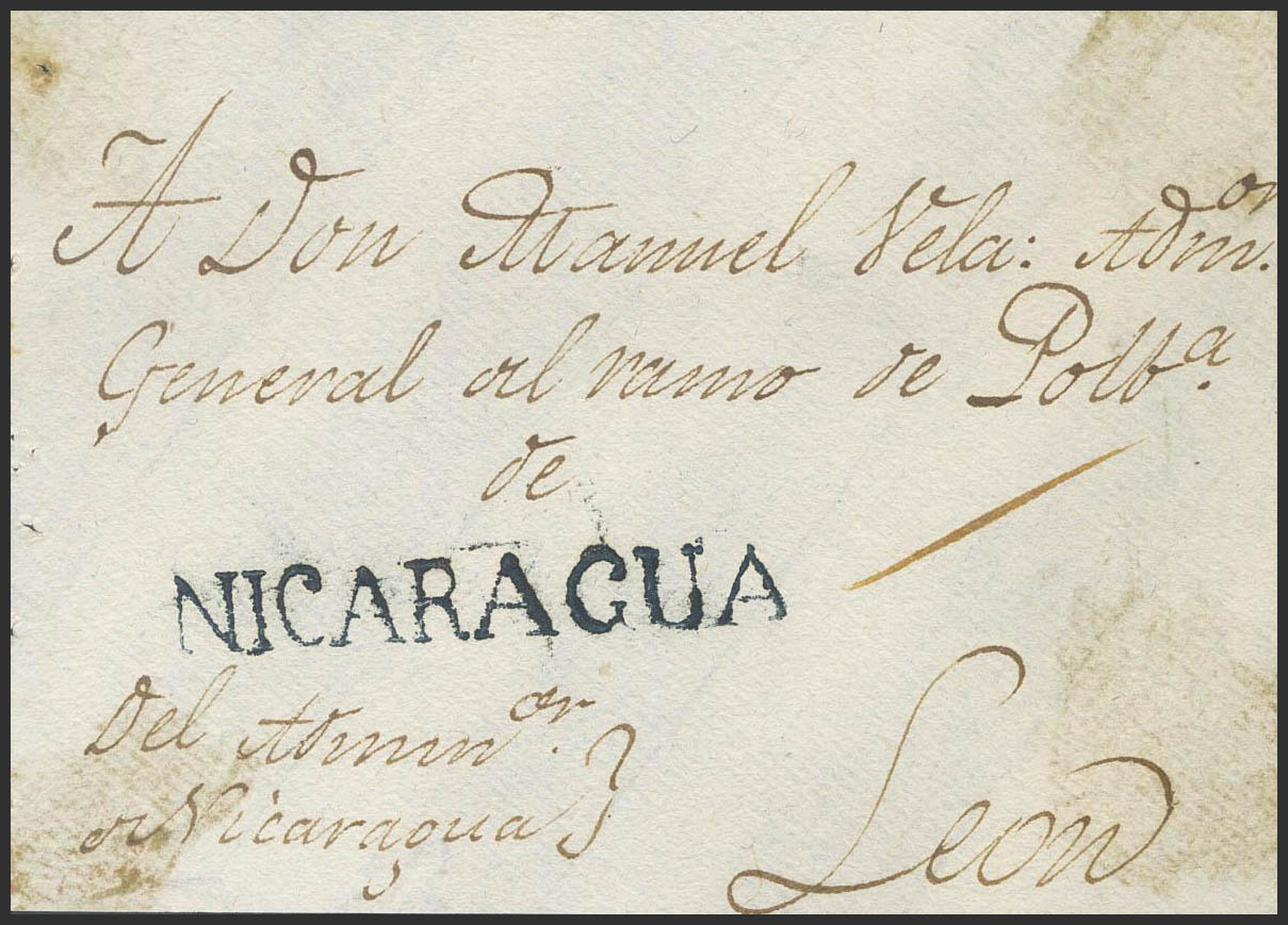 (1809ca). Frontal de RIVAS (NICARAGUA) a LEON. Marca NICARAGUA, en negro, en nuestra opinión su estampación se produce durante el periodo colonial español en América (P.E.1) edición 2004. MAGNIFICO Y MUY RARO.