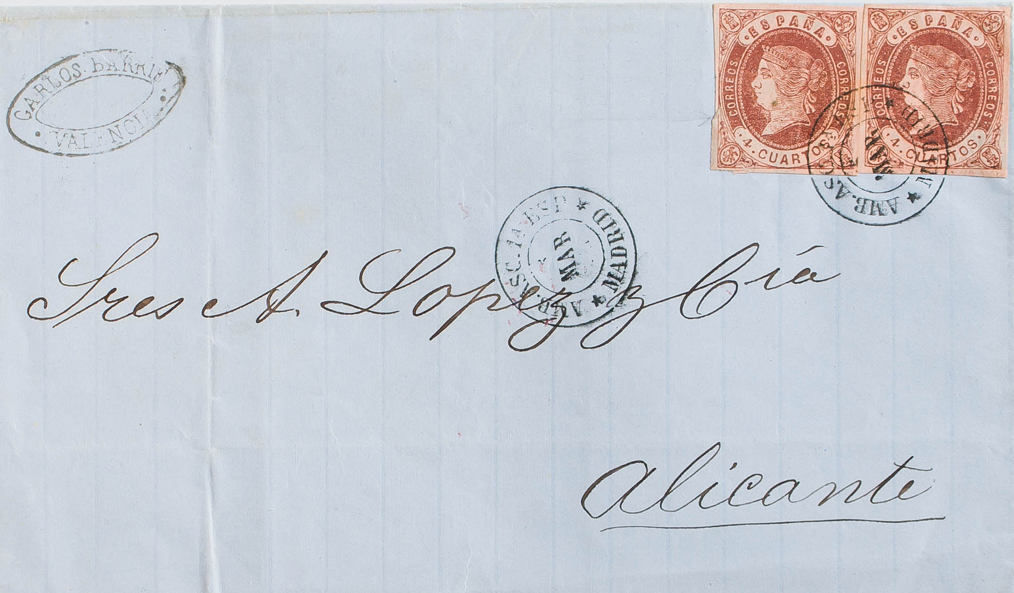 58(2). 1863. 4 cuartos castaño, dos sellos. VALENCIA a ALICANTE. Matasello AMB. ASC. 1ª ESP / *MADRID*. MAGNIFICO E INUSUAL, ESPECIALMENTE CON ESTA ESPECTACULAR ESTAMPACION.
