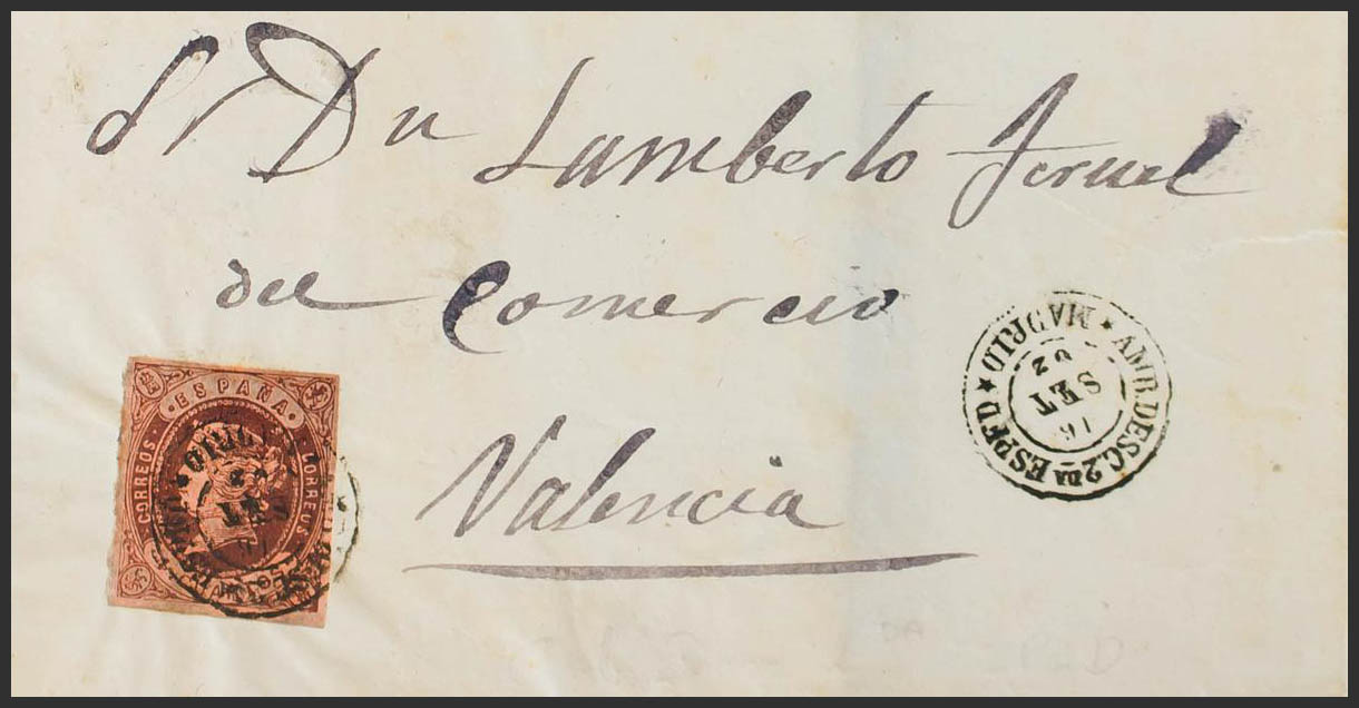 58. 1862. 4 cuartos castaño. Dirigida a VALENCIA. Matasello AMB. DESC. 2ª ESPED / *MADRID*. MAGNIFICA Y MUY RARA.