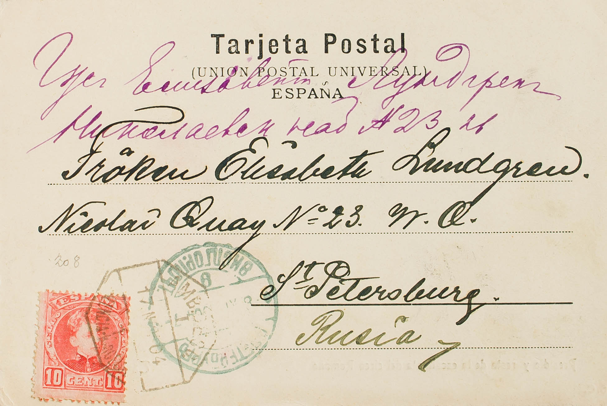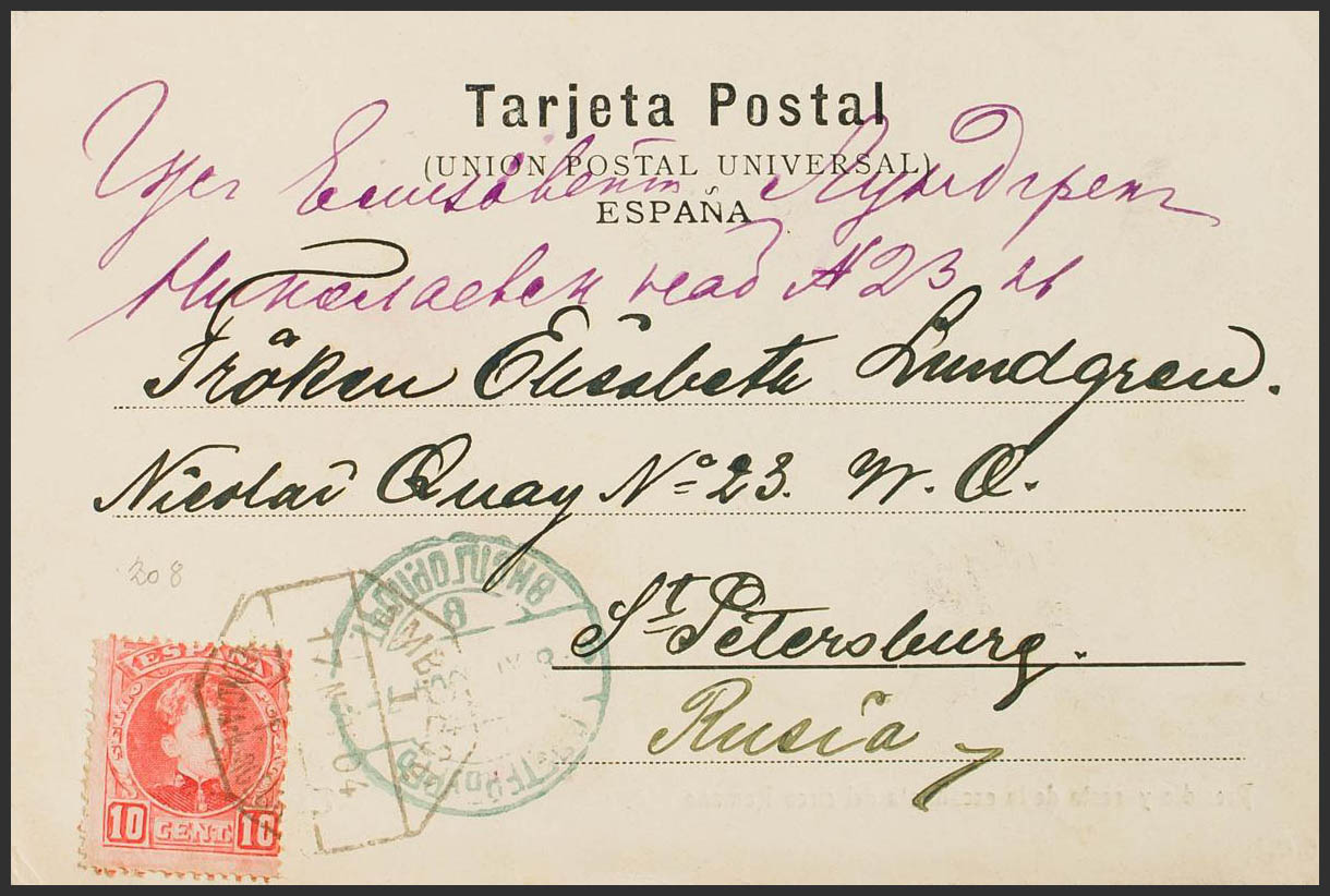 243. 1904. 10 cts rojo. Tarjeta Postal dirigida a SAN PETERSBURGO (RUSIA). Matasello AMB.DESC. / VALENCIA-BARCELONA, en el frente llegada. MAGNIFICA E INUSUAL DESTINO.