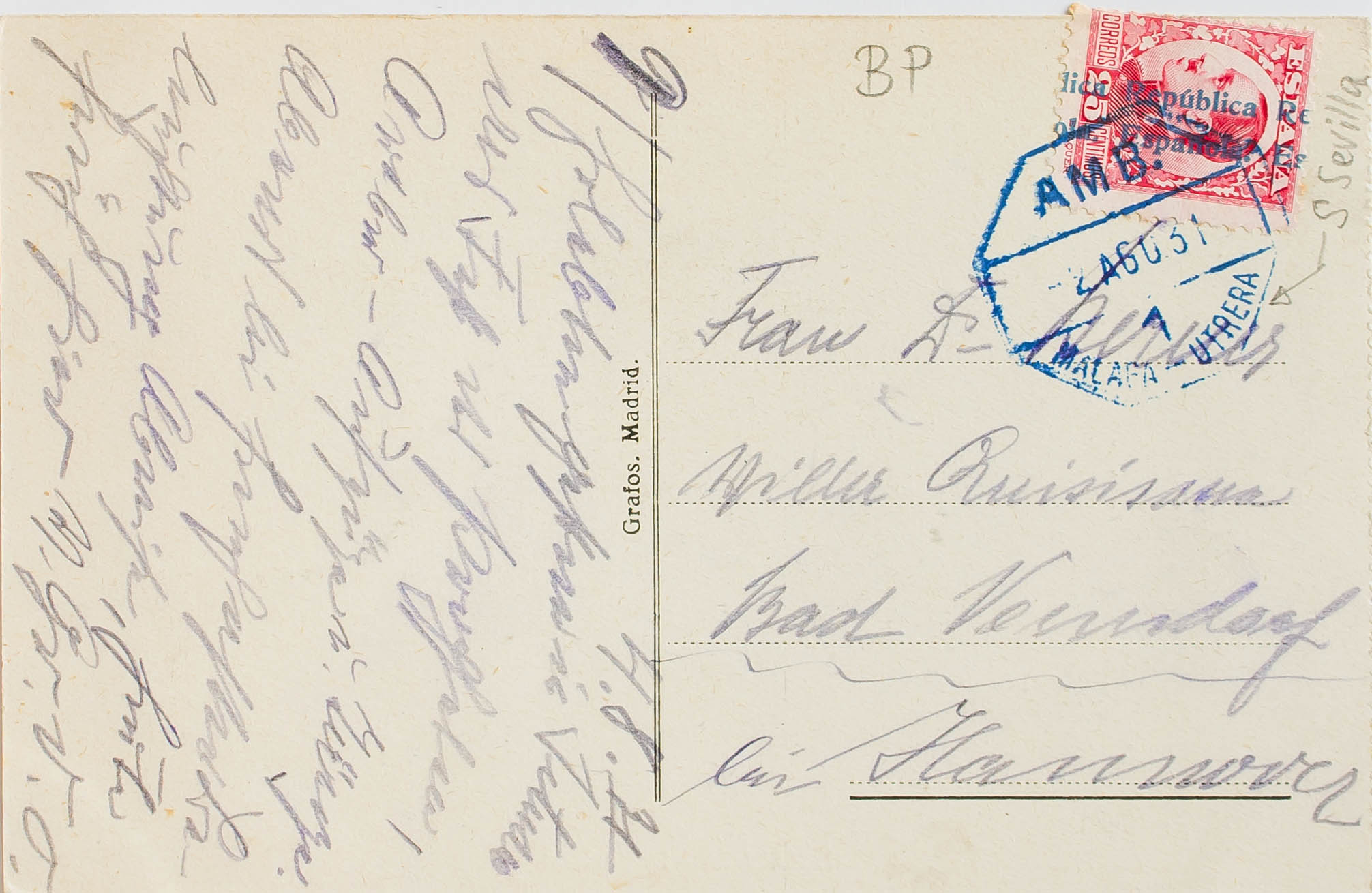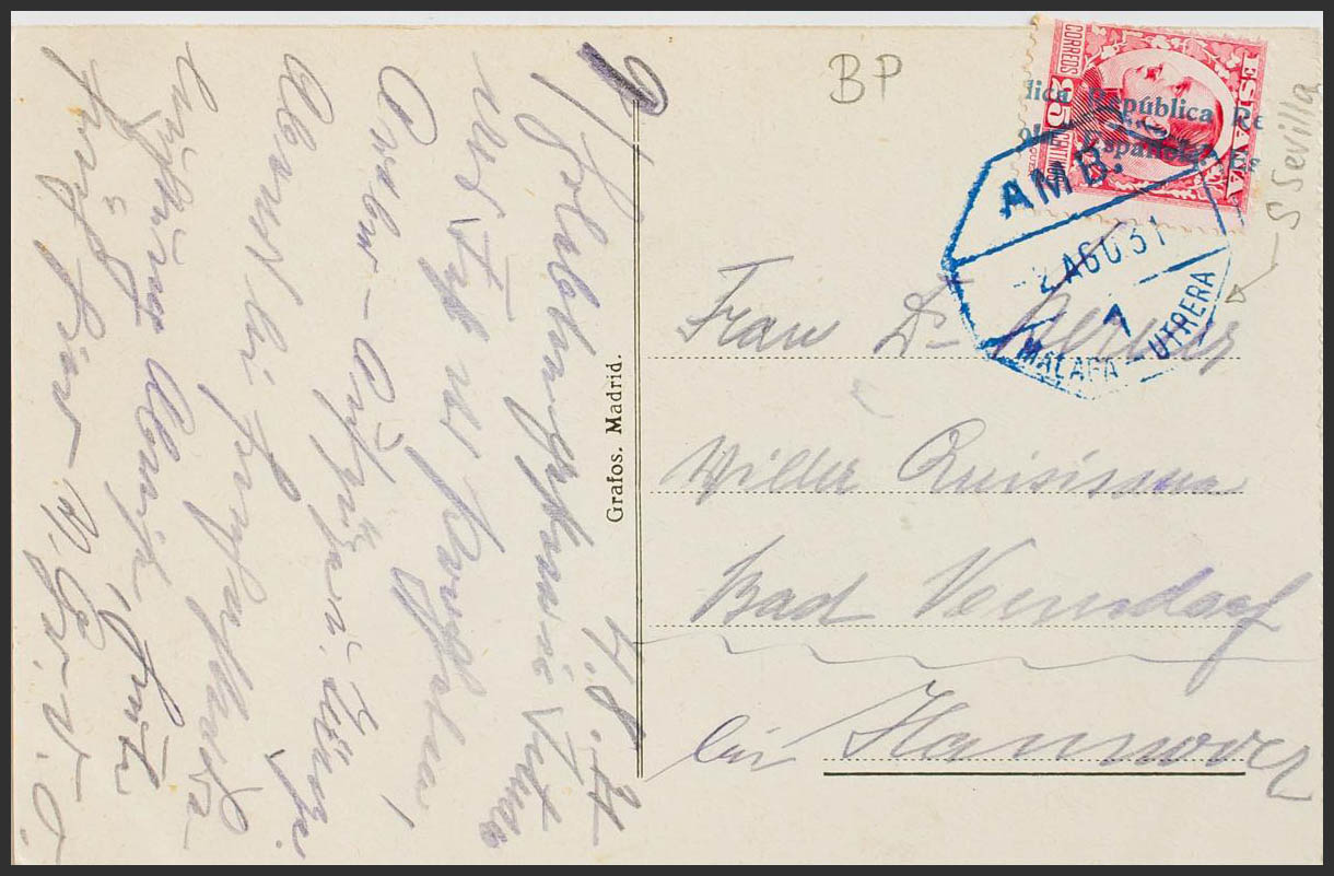 Ambulante. Historia Postal. AMB.MALAGA-UTRERA, en azul. MAGNIFICA.